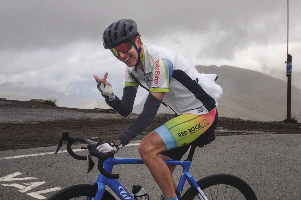 With about 10k to go it started to sprinkle and then wit 4k to go it started to rain. At the top it was raining hard so we stopped for a moment and then descended to  the restaurant.